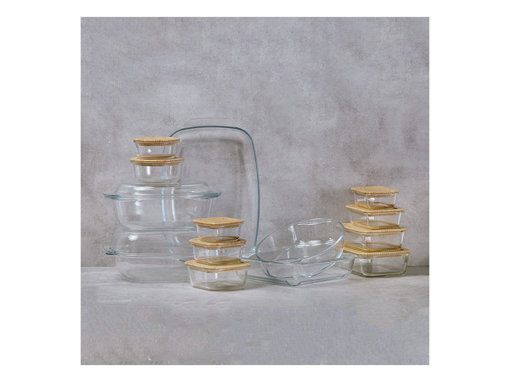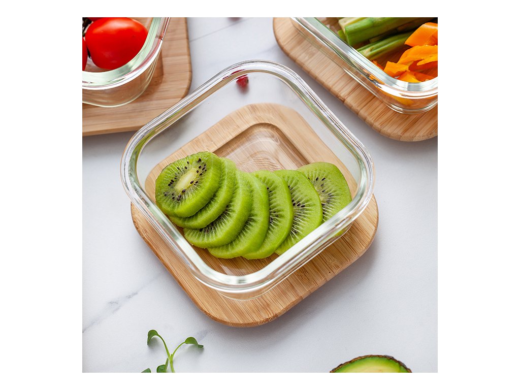 Bambusové víčko je vyrobeno z přírodního materiálu, který je odolný a snadno se udržuje. Bambusové dřevo je přirozeně antibakteriální, takže pomáhá udržet potraviny čerstvé. Těsnění je vyrobeno ze silikonu a zabraňuje vniknutí vzduchu a vlhkosti do dózy. Sklo je žáruvzdorné, nepřenáší pachy a je odolné proti poškrábání. Výška dózy 8,8 cm, délka 17,8 cm a šířka 17,8 cm. Skleněná dóza (bez víčka) je vhodná do mikrovlnné i klasické trouby, mrazáku, je možné mýt ji v myčce.