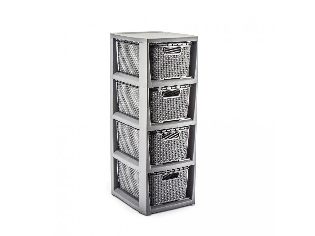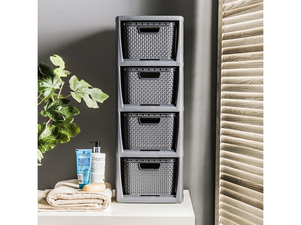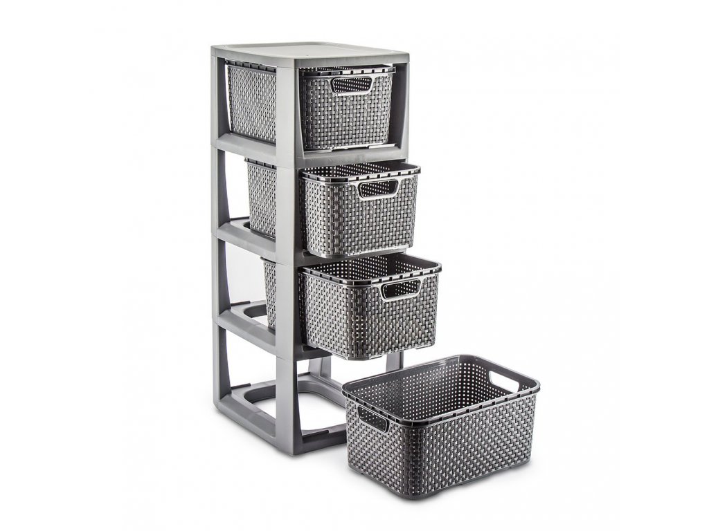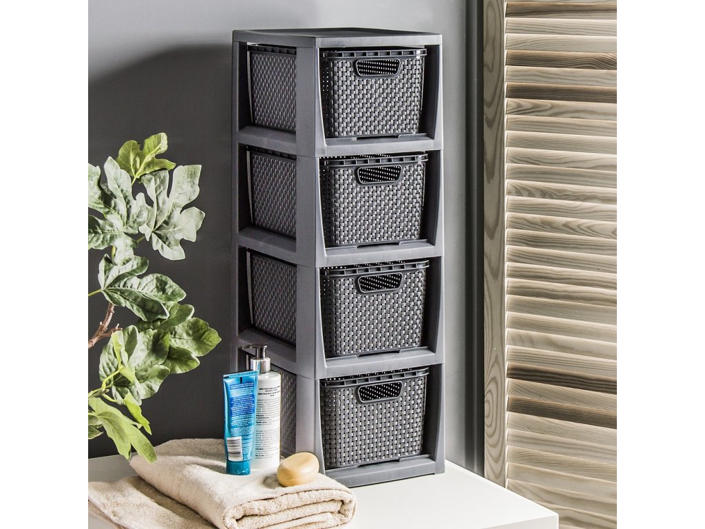 Plastová komoda Rattan je velmi dobré řešení pro uskladnění v malých prostorách. Vyrobeno z kvalitního plastu (bez ftalátů) je ideální pro místnosti jako koupelna, šatna, dětský pokoj nebo domácí kancelář . Rozměr stojanu: 64,3 x 24 x 29,5 cm , čtyři vyjímatelné košíky. Rozměr koše - 13 x 19 x 28,3 cm. Elegantní barevné provedení v antracitové barvě