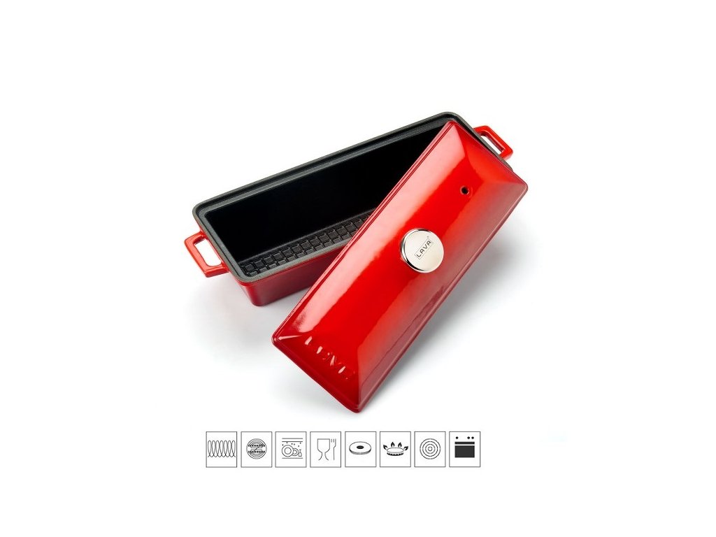Teriny Lava metal jsou vyrobeny z masivní smaltované litiny s nepřilnavým povrchem. Jsou vhodné pro použití v troubě, připravit v nich můžete buchty nebo pomalu péct maso, skvělé jsou na přípravu domácí paštiky nebo krásně voňavého chleba. Jednoduše multifunkční pomocník. Díky praktickému tvaru a velikosti můžete terinu použít i pro přípravu sladkých dezertů. Ucha po stranách formy usnadňují manipulaci a servírování. Červená s barevně sladěnou poklicí, která je opatřena nerezovým úchytem, má vnitřní rozměry 11x29 cm. Celková délka s úchyty je 33 cm, výška s poklicí 10,8 cm. Mytí v myčce nedoporučujeme, po použití umyjte horkou mýdlovou vodou a otřete dosucha.