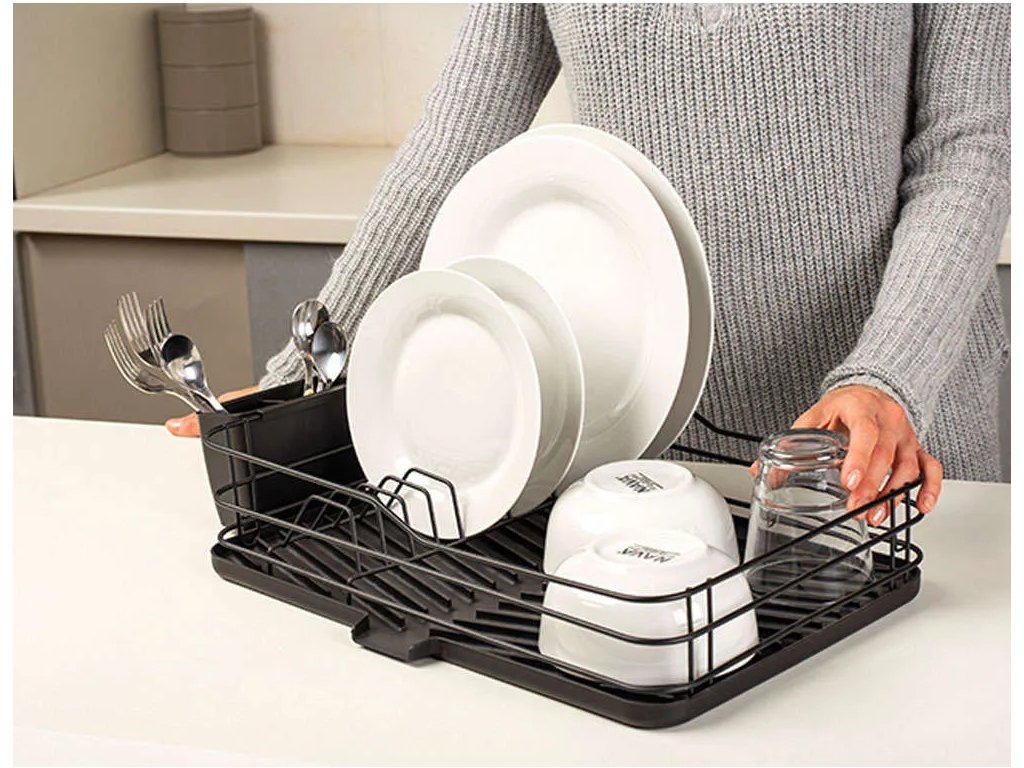 Odolná, praktická obdélníková konstrukce odkapávače, vyrobená z černého matného kovu má kompaktní tvar a velikost, takže jej lze snadno umístit i do dřezu. Antioxidační povlak činí odkapávač odolný vůči korozi a zároveň zabraňuje poškrábání povrchu dřezu.