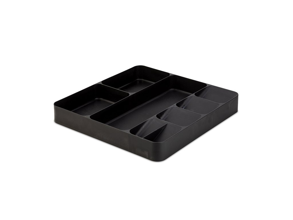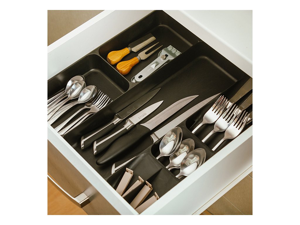 Je vyroben z odolného vysoce kvalitního plastu a má 3 překrývající se přihrádky na příbory a 5 přihrádek různých velikostí. Díky ergonomickému designu je to praktický a zároveň moderní pomocník pro organizaci kuchyňských zásuvek.