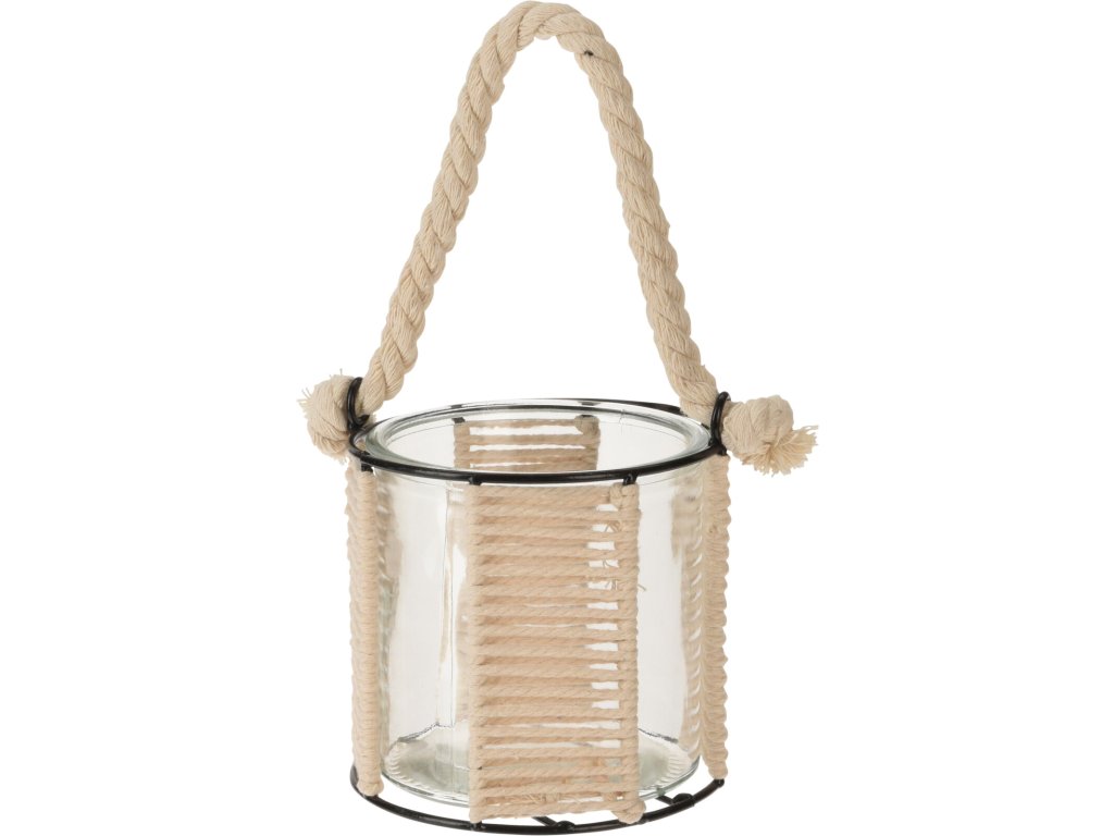 Tento skleněný svícen o průměru 13,5 cm a výšce 12 cm se stane ideálním doplňkem Vašeho interiéru. Elegantní kombinace skla, kovu a juty Vás upoutá na první pohled. Můžete využít jako svícen nebo třeba vázu. Určitě najdete místo ve své domácnosti, kam by se tato dekorace hodila.