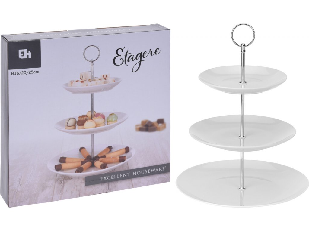 Výborný pomocník při servírování je tento třípatrový stojan. Malé jednohubky, sýry nebo drobné zákusky a koláče můžete svým hostům přinést najednou na tomto stojanu. Kombinace kovu a porcelánu vypadá skvěle. Průměry talířů - 25 cm, 20 cm a 16 cm.